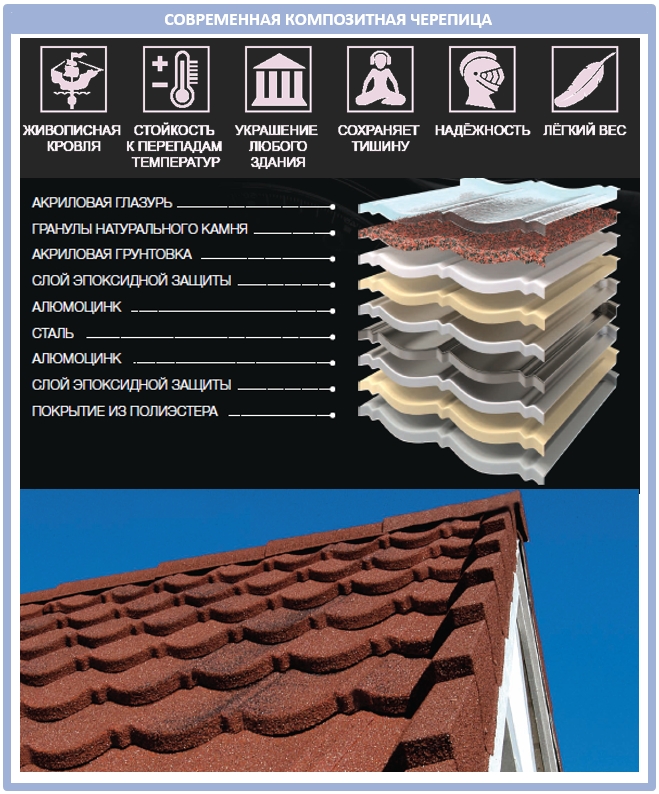 Что собой представляет композитная черепица? Итак, композитная черепица – это бесшумное, эстетичное легкое кровельное покрытие преимум-класса. В нем сочетаются самые лучшие качества металла (особенно алюмоцинка) и полимерно-качественного покрытия.