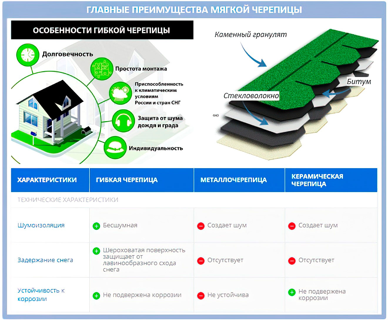 • Звукоизоляция. На мягкой поверхности кровли почти не слышен шум дождя.